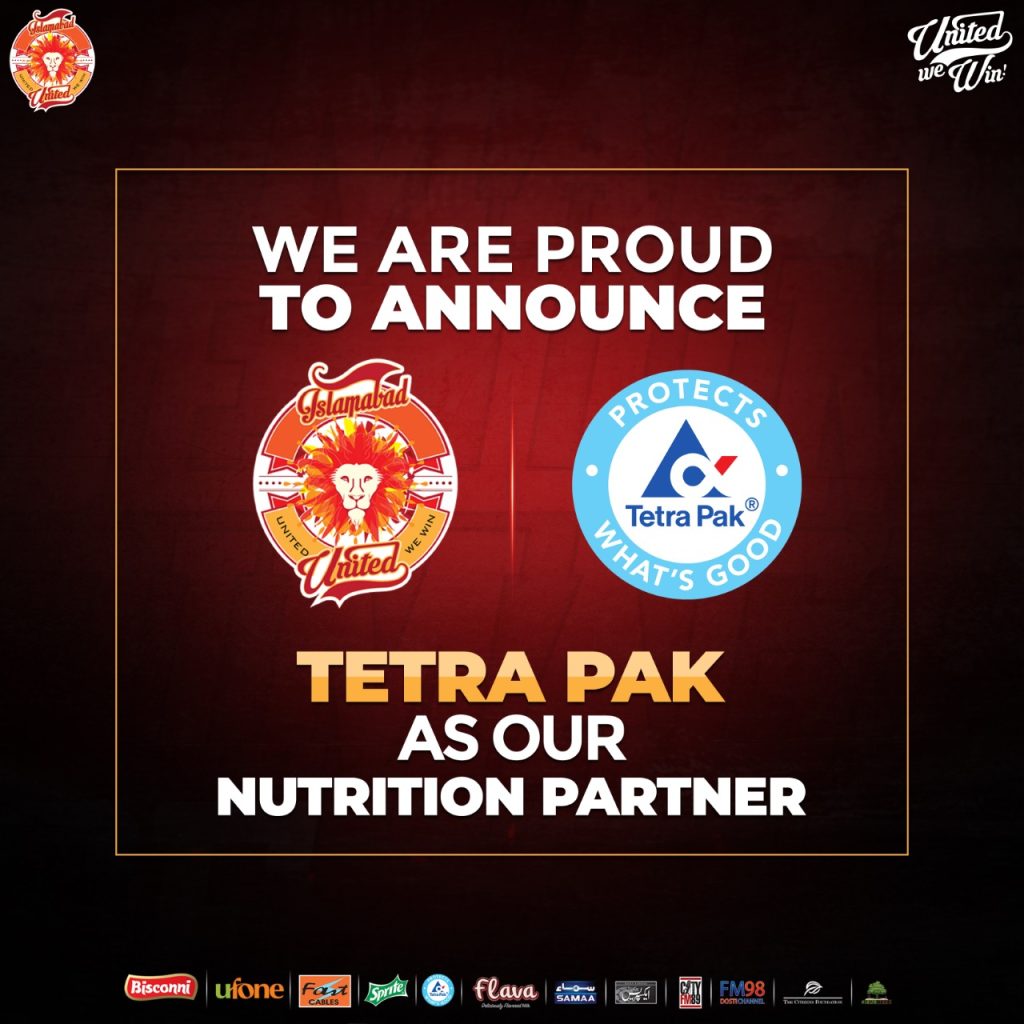 Islamabad, 3 December 2019 – Islamabad United, the most successful franchise in HBL PSL history, is proud to announce its partnership with Tetra Pak as one of the sponsors of the franchise for the fifth season of the HBL PSL. Their logo will appear on Islamabad United’s playing kit for the duration of the tournament.