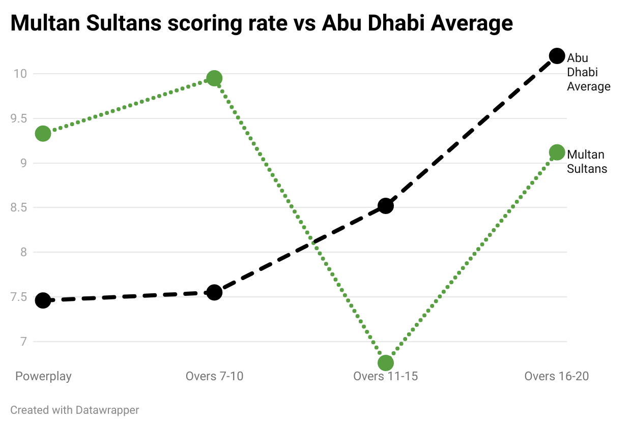 Their approach with the bat can be seen with their scoring rate in the Abu Dhabi leg this season, they have been better than the Abu Dhabi average in the first 10 overs of the innings, but their lack of batting depth is evident given their scoring rate in the back end of the innings.