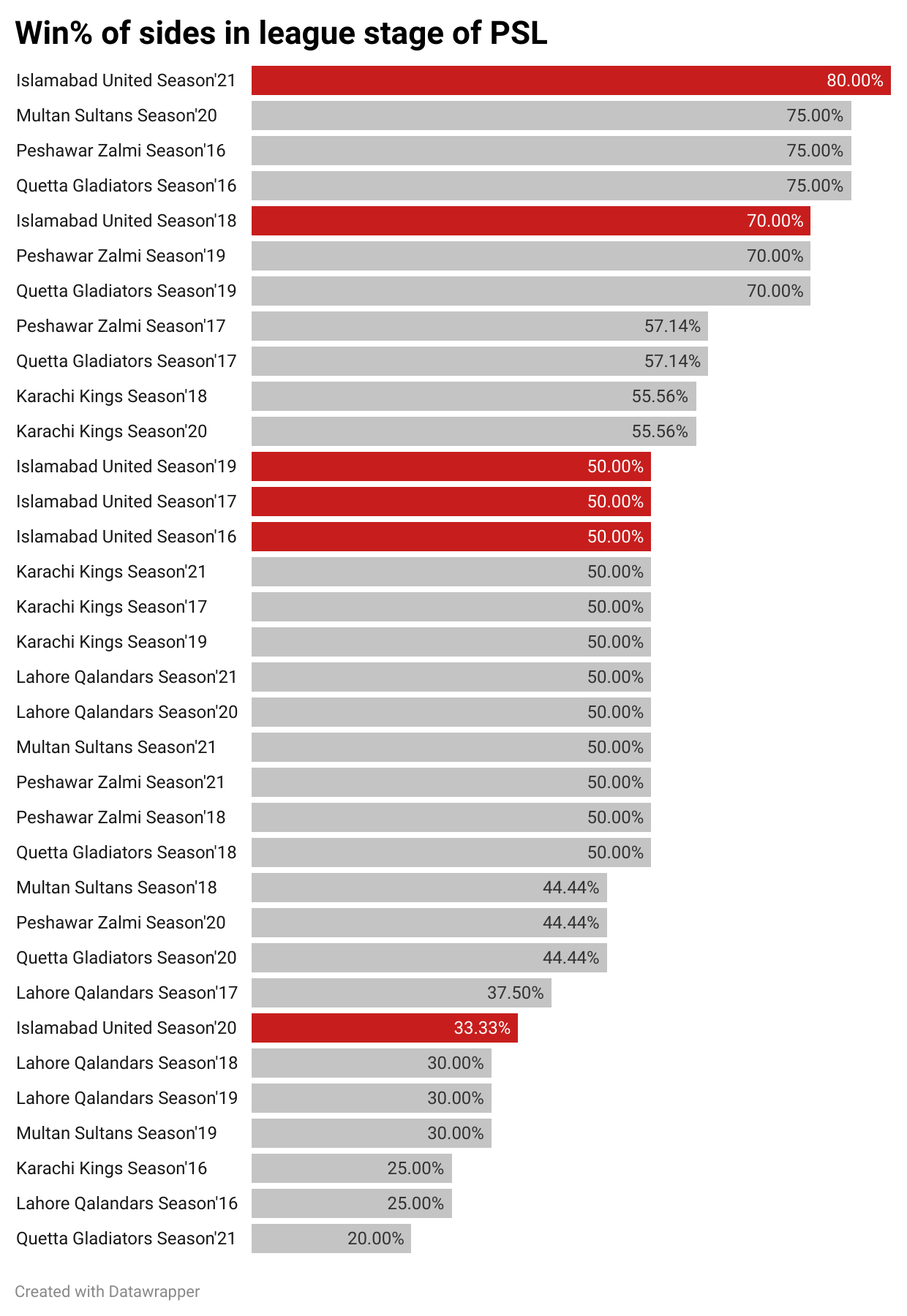 This is where there is a difference between Islamabad United and the remainder of the league, Islamabad has won 8 of their 10 games this season, 3 more wins than the next best side. Their win% of 80 in the league stage is the best for any side in the PSL. Only 7 of the 34 have had a win% of over 70% in the league stage, of those 3 sides have caveats attached — Multan Sultans had 2 of their 10 games washed out, Zalmi & Gladiators in 2016 played only 8 games — so for Islamabad United to finish with a 80% win record in the league stage is mighty impressive, more so when you factor in that the side has not played their best 11 for their final 2 games this season and one of their losses came on the final ball of the match.