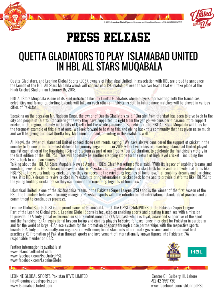 ISLU NewsQuetta Gladiators to Play Islamabad United in HBL All Stars Muqabala Posted on January 10, 2024 by admin 10 Jan Islamabad United Prepare for HBL PSL 3 TCF and Islamabad United stand united for education